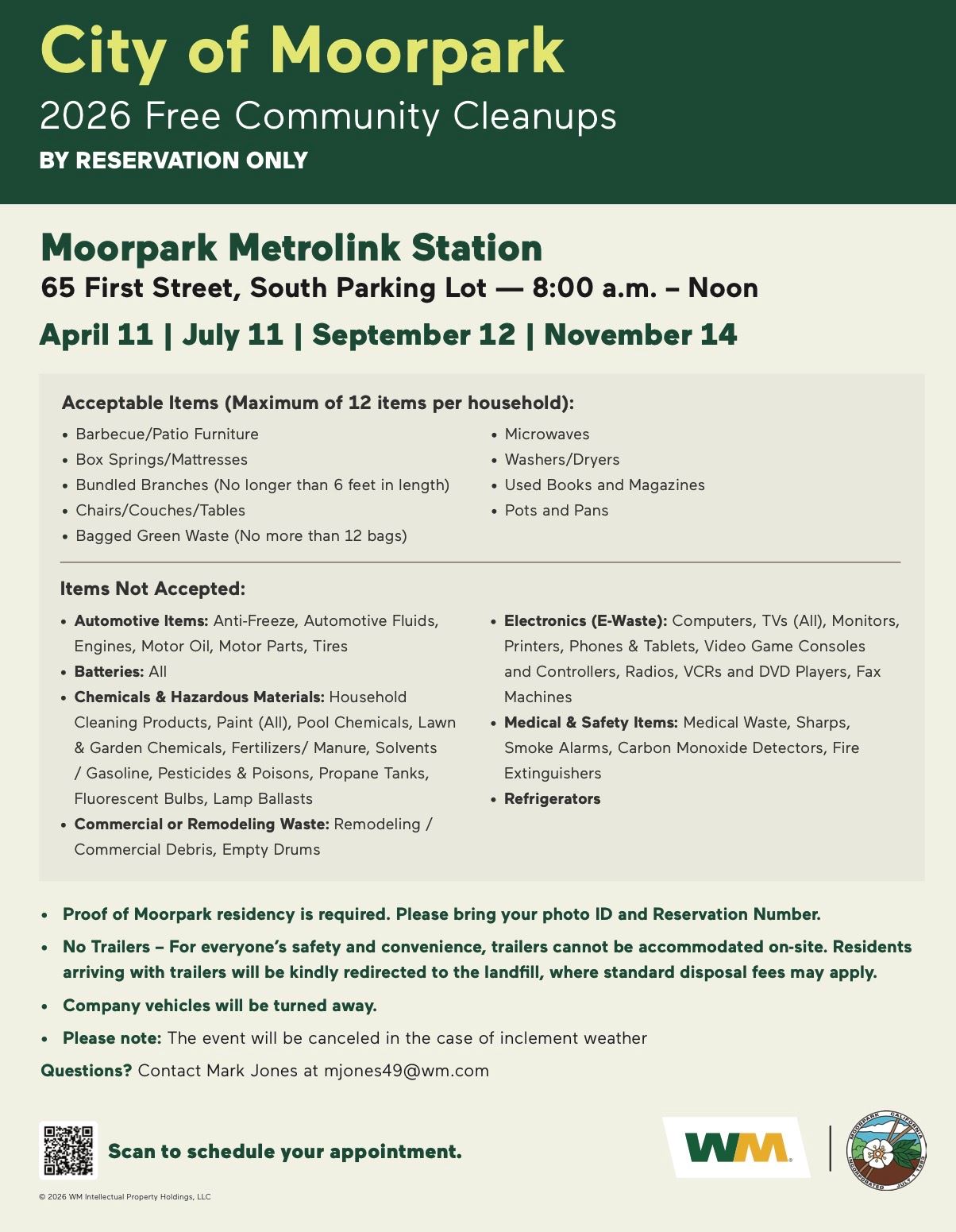 Proof of City of Moorpark residency is required. Community Cleanup Events are by appointment only; walk-ins will not be accepted.